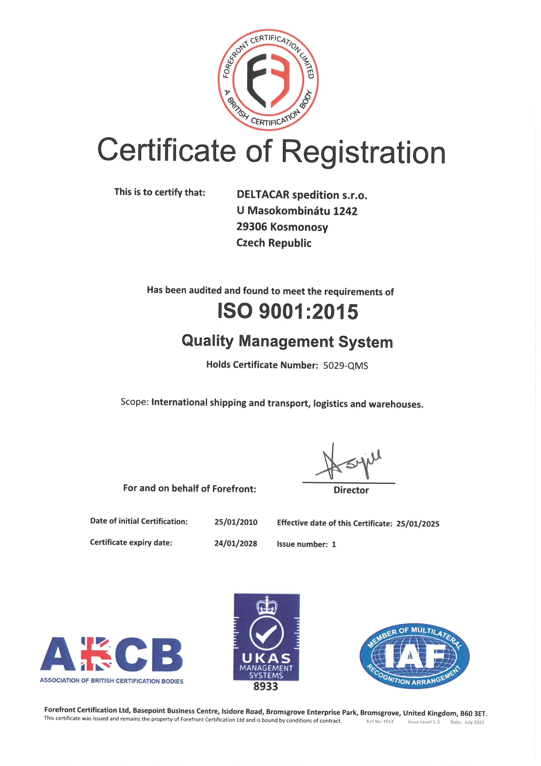 Každoročně firma prochází certifikačním auditem dle normy ČSN EN ISO 9001.