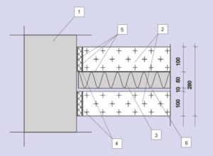 1 – sousedící stěna 2 – sádrová deska VG-ORGH tl. 100 mm 3 – minerální vata, tl. 50 mm